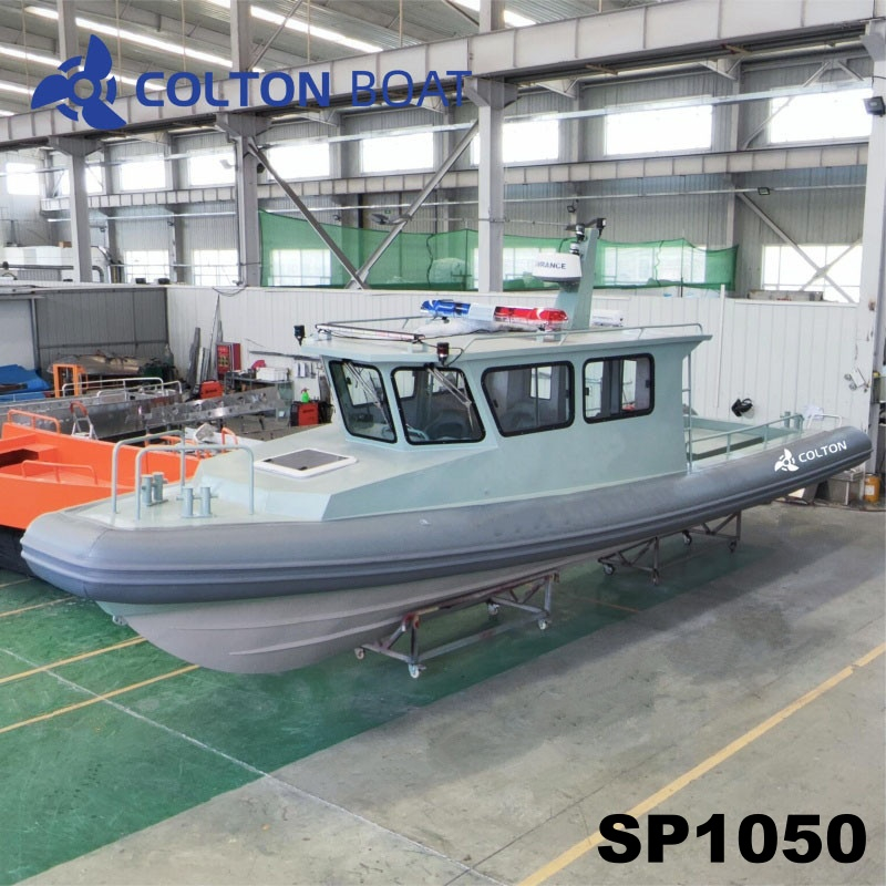 | • High tensile chromated & powder coated aluminum hull • Boat deck is 5mm plate, keel and transom is 12mm plate • Boat hull is staggered • Front cabin with rest room • Hypalon tube with 8 air compartments • Integrated rear seat and sunbed • Aluminum T-top • 650L integrated built in fuel tank • Cabin room with middle console and 4 seats • Bilge pump • Anti-slip EVA pad • Heavy duty rubbing strake • Reinforced keel guard • Navigation lights, electric switch on console, search light | • Hydraulic steering system & steering wheel • 80L water tank and shower system • Hand basin,Toilet and refrigerator • Side stroller • Step lights and underwater lights • Boat trailer • Boat cover • Electric inflating pump • Electric Windlass • Anchor and anchor chain • Compass • VHF set • Blue tooth speaker system • Garmin/Lowrance/Simrad GPS and sounder • Yamaha or Mercury engine |